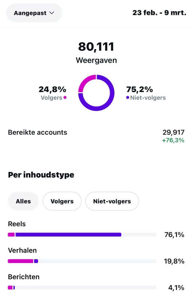 Vanaf het moment dat ik door de R&R community meer pratende reels postte gaat het heel lekker met de niet-volgers die mijn content zien. Ik zie veel meer interactie rondom mijn posts.