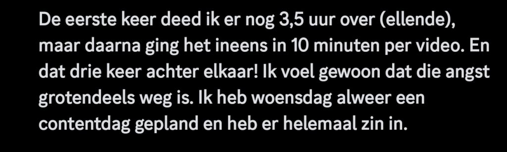 Ik heb 15 jaar lang verticale video’s gemaakt en heb al tien-tallen ondernemers gecoacht op dit vlak. Het verwoorden van wat je voelt + wilt uitstralen + het out in the open gooien = manifestatie in de letterlijke vorm.